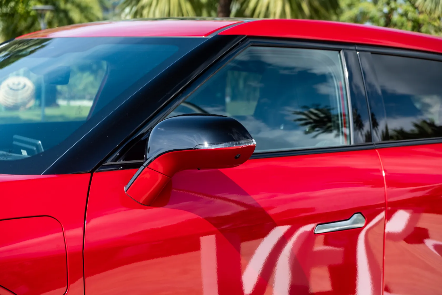 Phần trên của ốp kính chiếu hậu sơn đen bóng cũng trở thành điểm nhấn, tạo thêm sức hút cho thân xe VF 7. Tay nắm cửa thiết kế ẩn, không chỉ mang đến sự sang trọng cho mẫu ô tô điện phổ thông, mà còn tăng thêm tính khí động học.