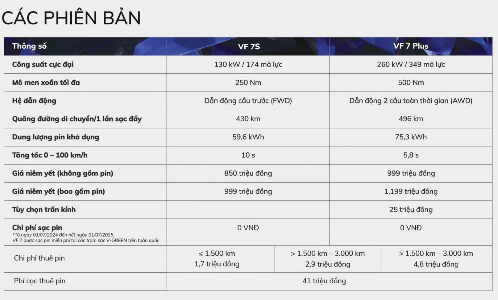 Trong khi đó, VF 7 phiên bản Base được trang bị một động cơ điện có công suất tối đa 130 kW (tương đương 174 mã lực), mô-men xoắn cực đại 250 Nm cùng bộ pin dung lượng 59,6 kWh, có khả năng di chuyển quãng đường tối đa 375 km/lần sạc đầy (theo tiêu chuẩn WLTP). Nếu như phiên bản Plus sẽ đáp ứng tối đa đam mê tốc độ và nhu cầu di chuyển trên những chặng đường dài, thì phiên bản Base sẽ là lựa chọn đầy phong cách và linh hoạt trên những cung đường đô thị.