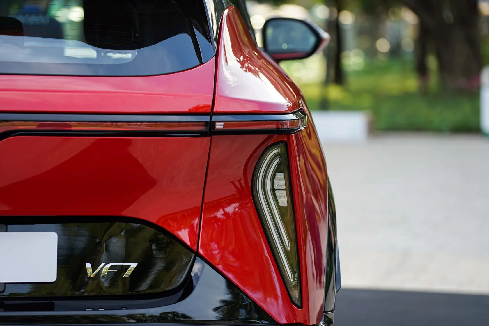 Đèn hậu được đặt gọn gàng trong hốc hình tam giác cách điệu, đặt 2 bên đuôi xe. Toàn bộ phần cản sau và xung quanh khu vực đặt biển số đều sơn đen, giúp hoàn chỉnh vẻ đẹp cơ bắp, rắn rỏi của VF 7.