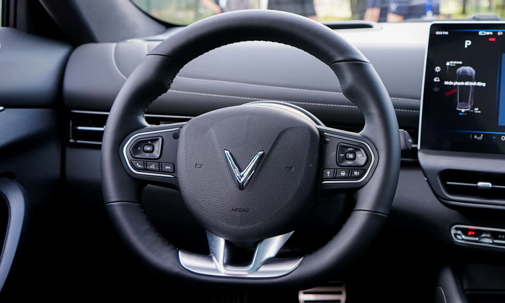 Vô-lăng xe thiết kế D-cut thể thao giống như những người anh em cùng nhà, song mang đến cái nhìn sang trọng hơn hẳn nhờ lối phối màu độc đáo. Đồng hồ hiển thị thông tin lái tiếp tục không có mặt trên mẫu SUV điện cỡ C của VinFast.